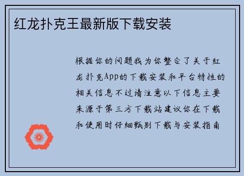 我已经帮你梳理了在苹果设备上下载和安装红龙扑克APP的步骤,以及一些重要的注意事项。整个流程大致可以概括为以下几个关键环节: mermaid flowchart TD A[访问红龙扑克官网] --> B[下载iOS APP安装包] B --> C[安装至桌面并信任企业证书] C --&g...